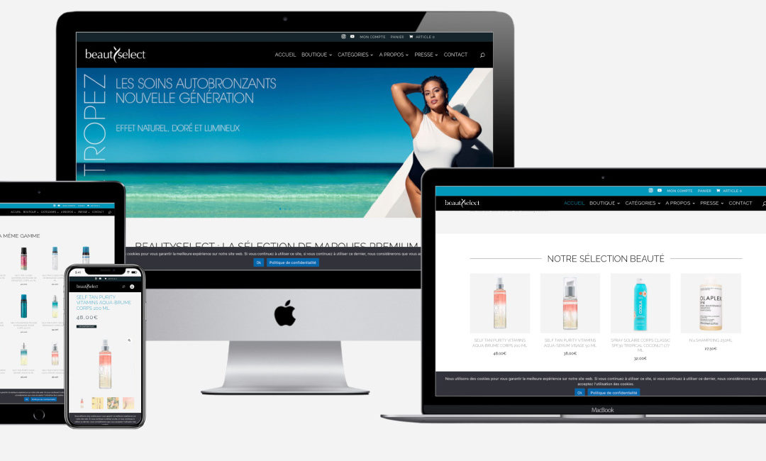 BEAUTY SELECTSite e-commerce | WordPress & Woocommerce Charte graphique webFonctionnalité vente en ligneIntégration xhtml & cssFormation à l’administration du site Site du distributeur officiel france de la gamme ST.TROPEZ, OLAPLEX et COOLA SOINS...